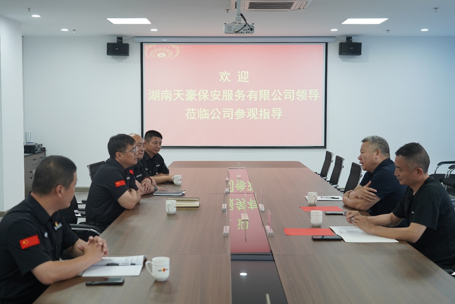 5月27日,湖南天豪保安服務有限公司董事長趙士友、總經(jīng)理吳燦光蒞臨我公司交流工作,公司黨委書記、董事長付志欣,黨委委員、副總經(jīng)理丁德鵬,黨委委員、副總經(jīng)理王成,辦公室主任范丙磊陪同。